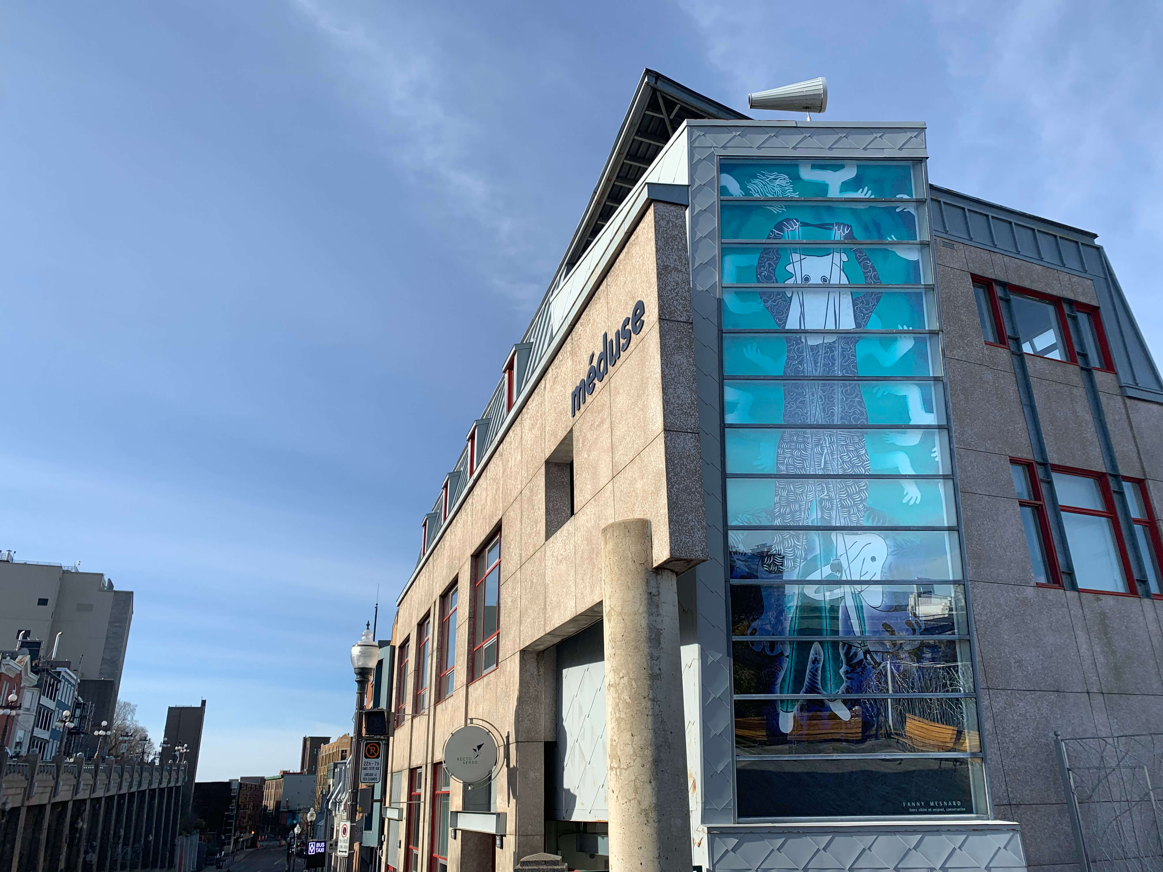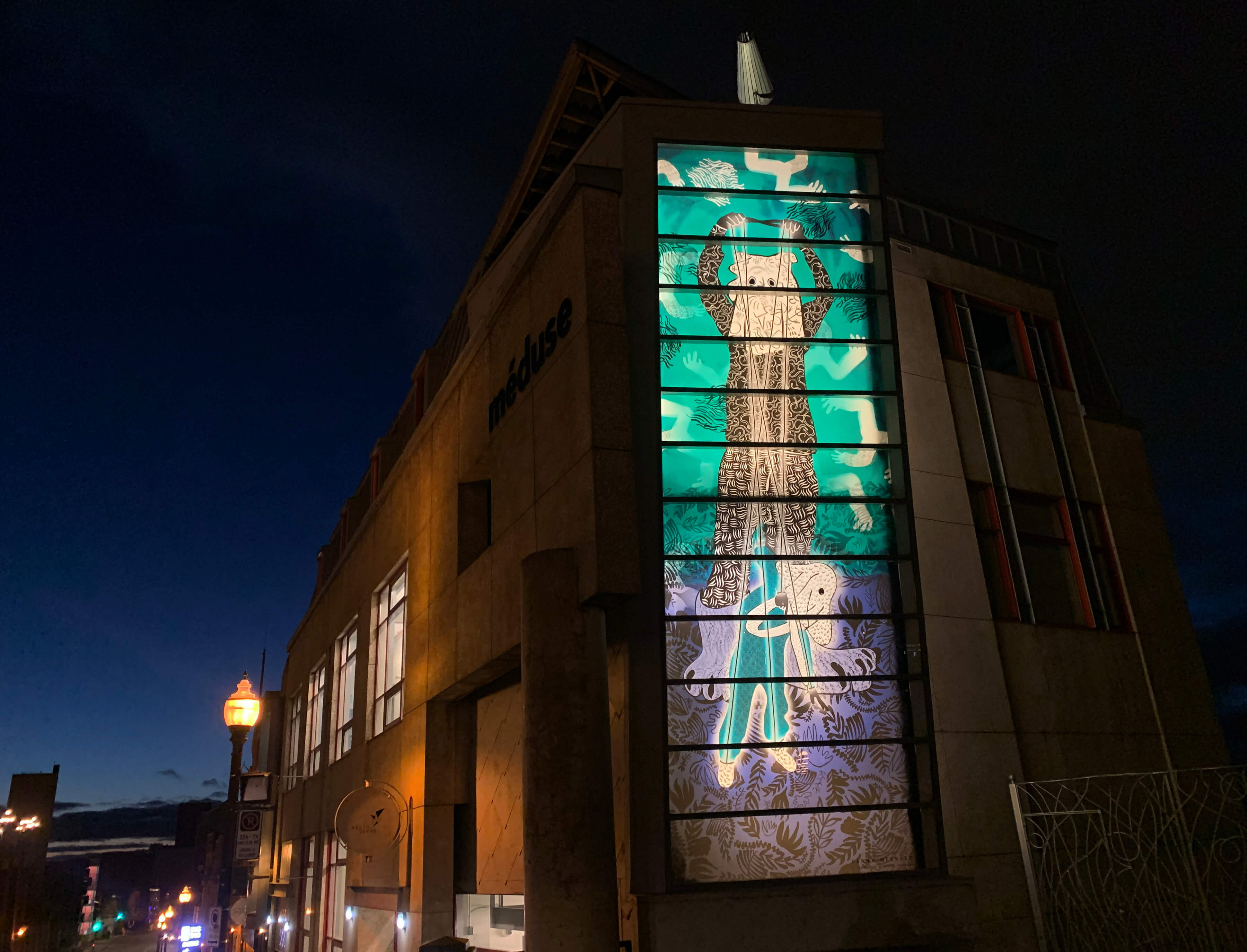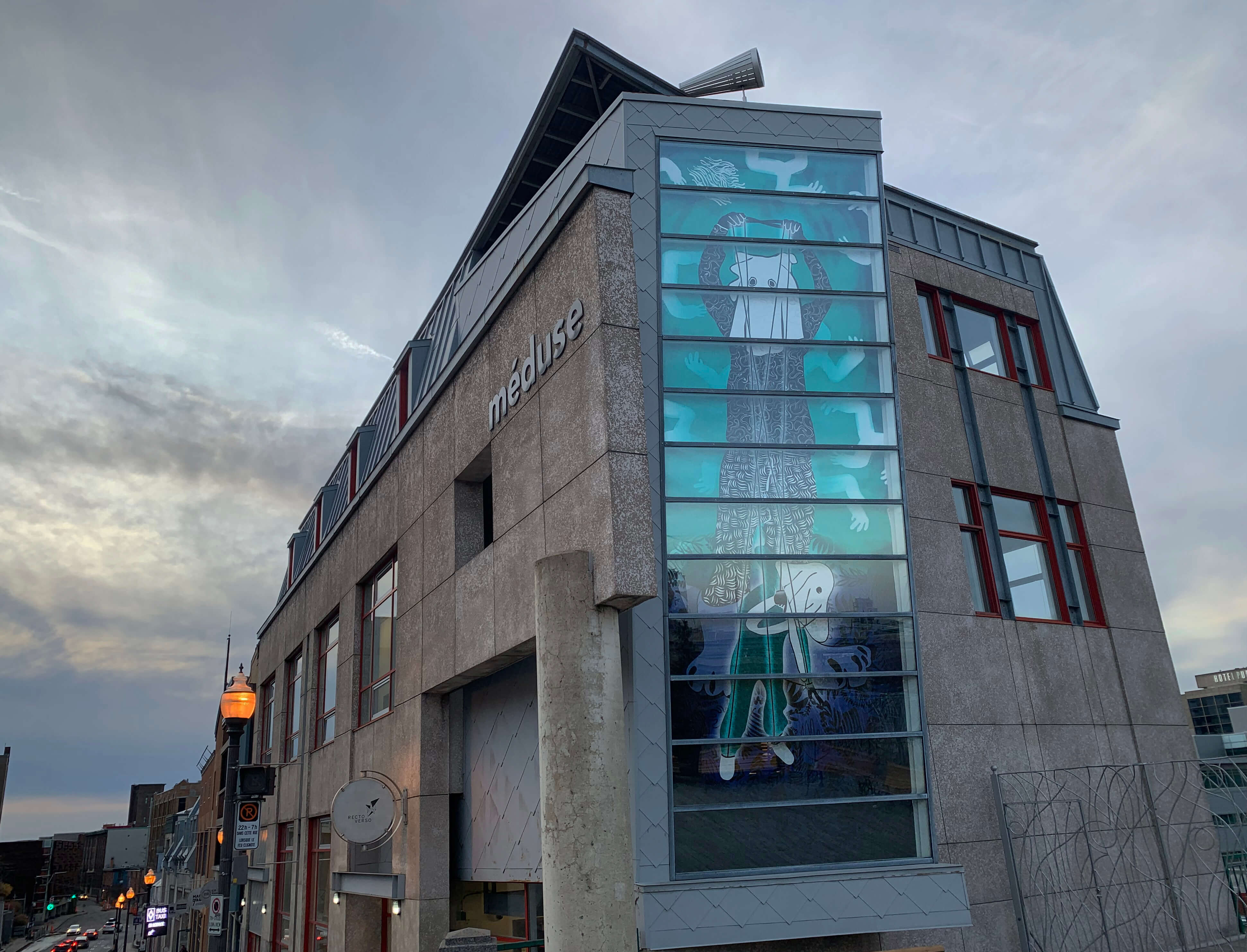 La baie vitrée est un nouvel espace de co-diffusion monumental sur la Côte d’Abraham, qui présentera au fil des prochains mois des œuvres spécialement conçues par les artistes pour cet espace. Habituellement utilisée à des fins publicitaires, cette vitrine déploie désormais son potentiel artistique en amenant l’art directement dans la ville, en affirmant visuellement la présence de Méduse et en invitant le public à se rapprocher des centres d’artistes qui composent la coopérative.