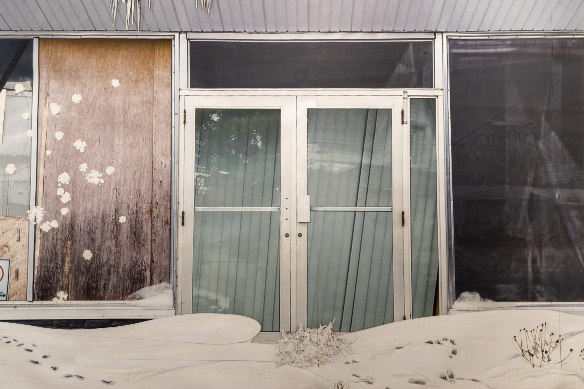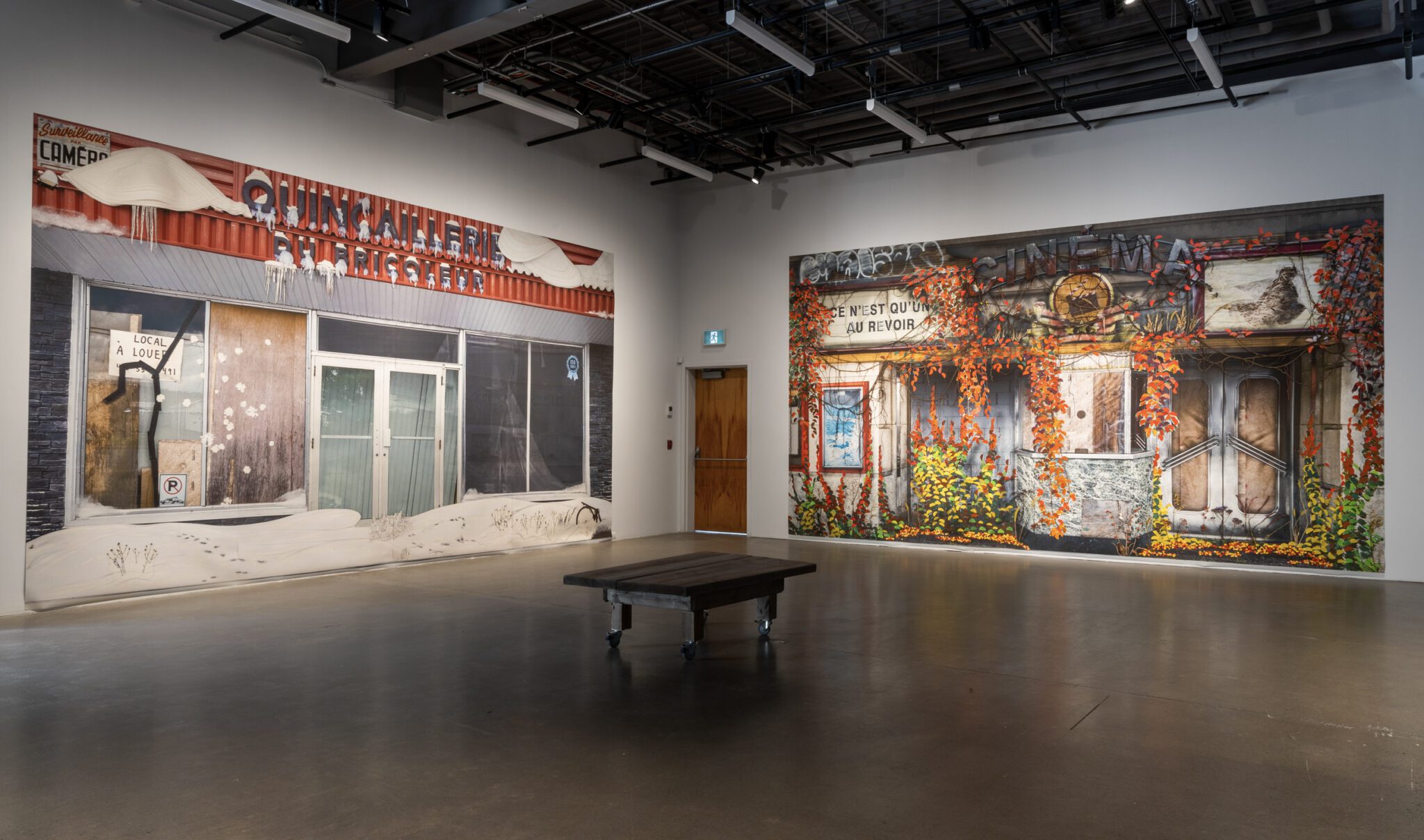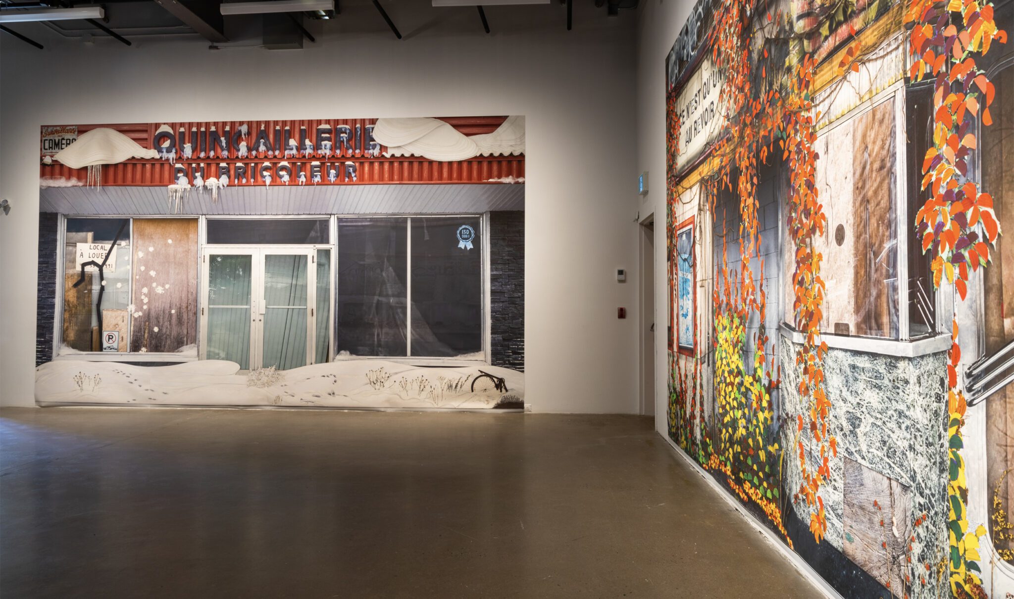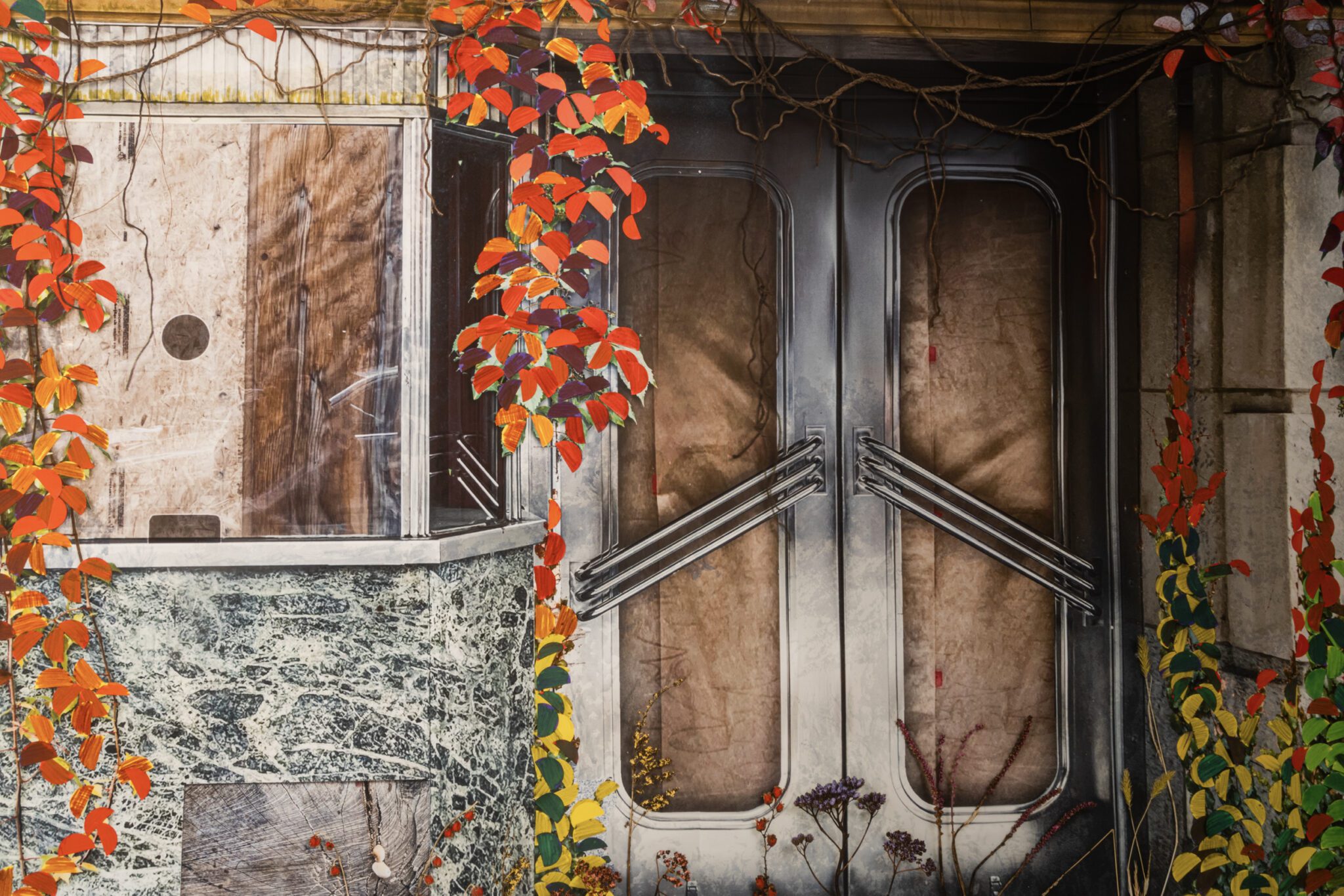 L’artiste les observe et les photographie ainsi depuis longtemps, sensible à leur disparition tranquille. Les images accumulées au fil du temps sont devenues les canevas d’interventions numériques et de bricolages, qu’il intègre en trompe-l’œil pour nous amener à les interroger dans le détail. Les graffitis rassemblés sur la vitrine d’Électrobec 2000 forment une dissonance de discours tantôt militants, tantôt comiques, se moquant tour à tour de l’idée du progrès qui sécurise tant nos sociétés. Ailleurs, les feuilles d’automne qui envahissent une façade sont fabriquées de toutes pièces comme des guirlandes colorées, nous rappelant notre responsabilité dans la perte de ces lieux aimés, mais aussi notre capacité à célébrer ce qu’il reste d’elles.