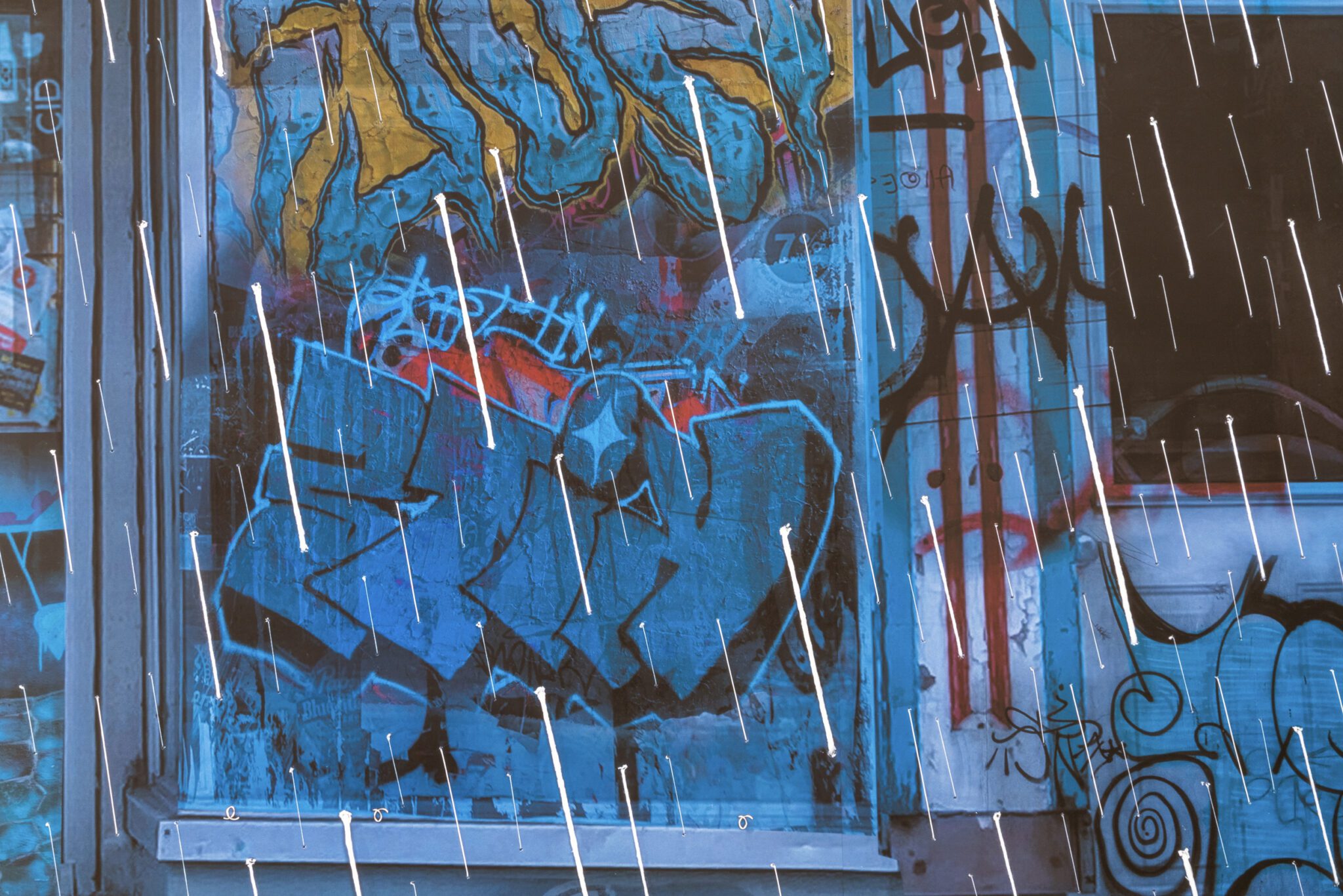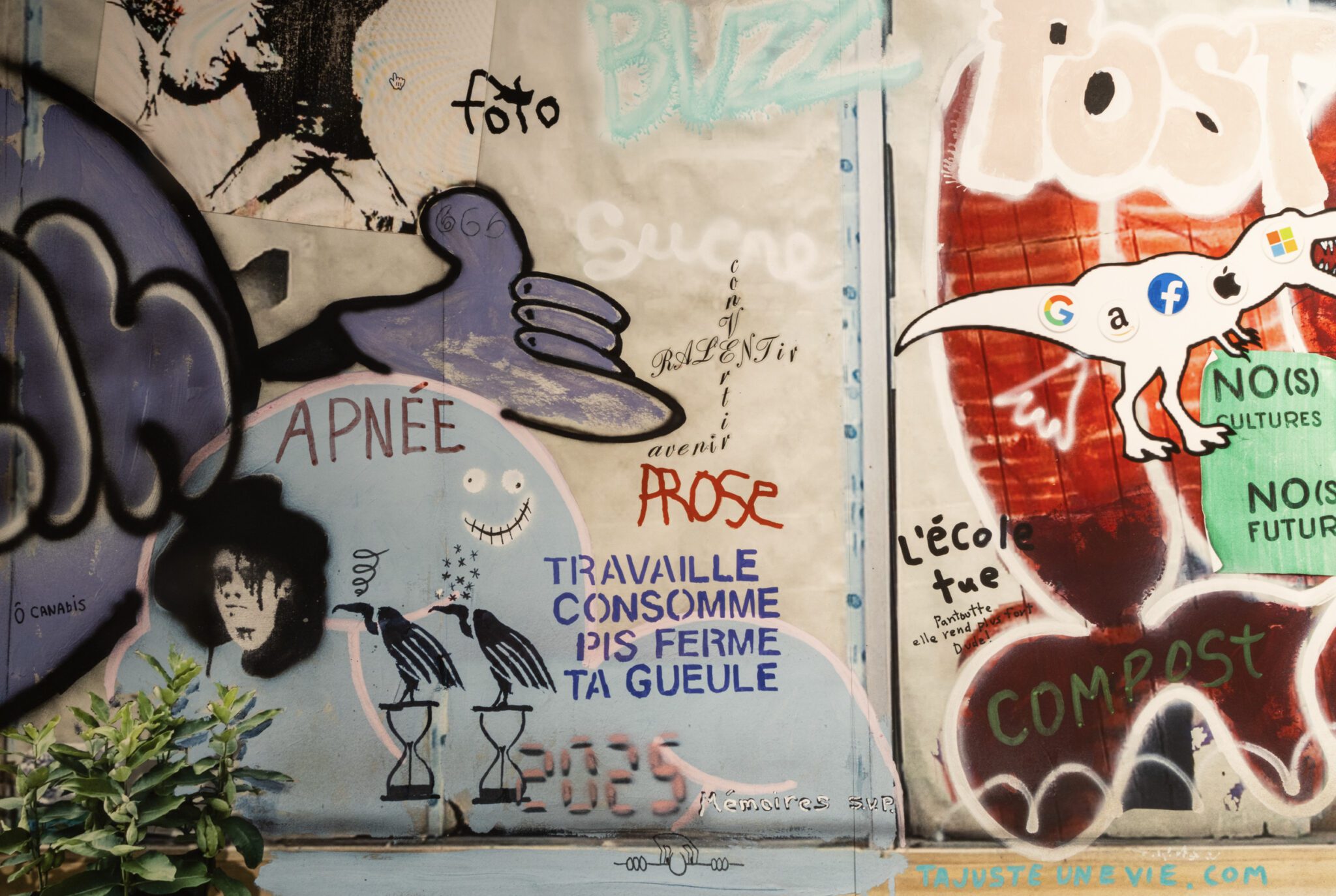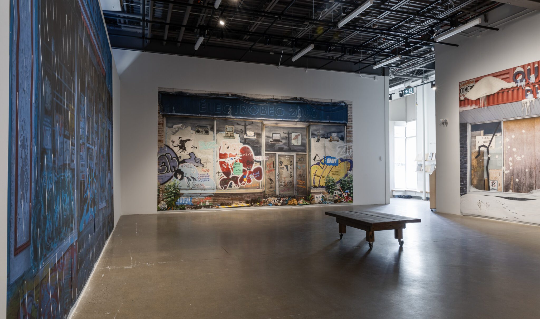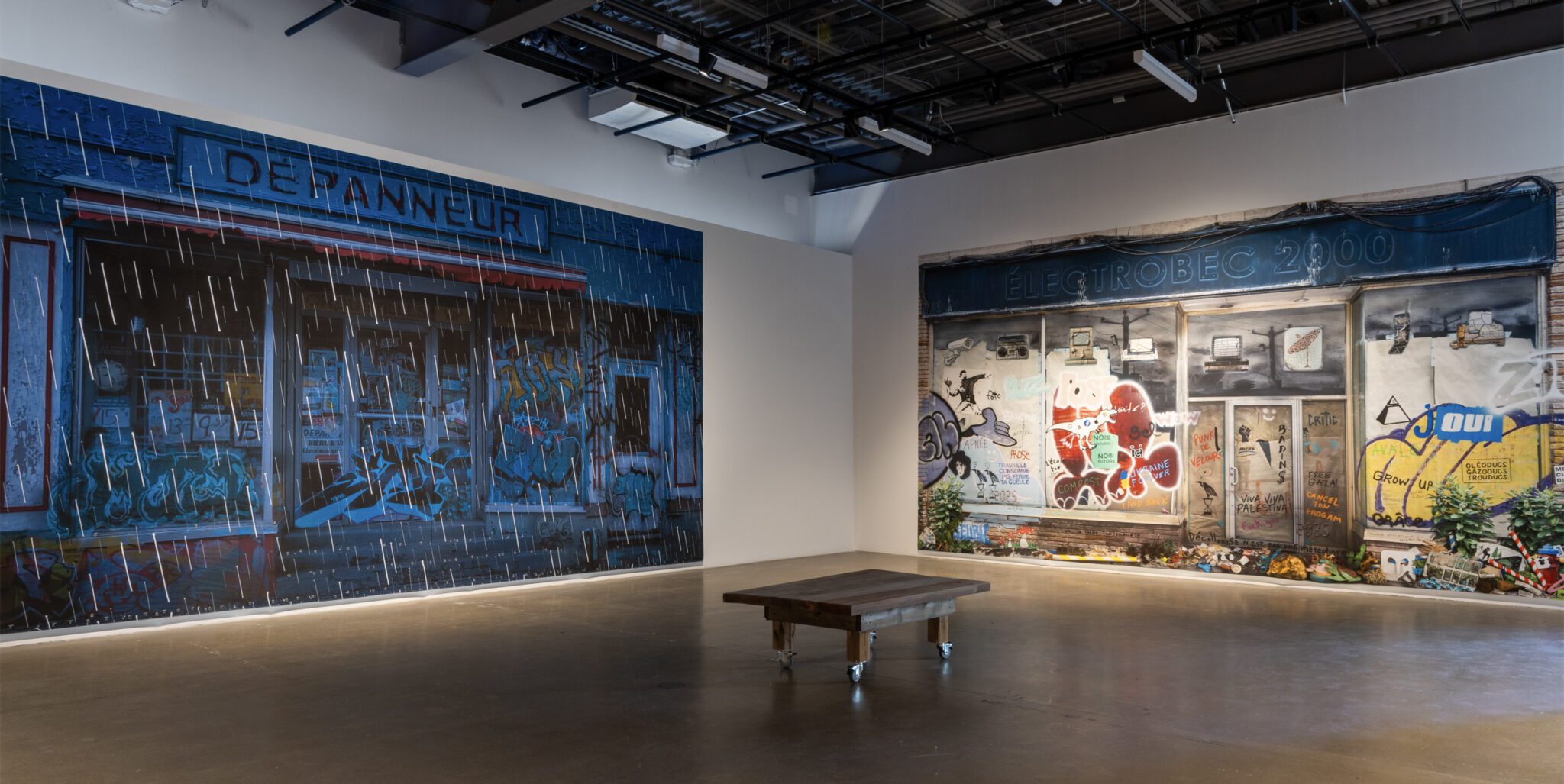 L’artiste les observe et les photographie ainsi depuis longtemps, sensible à leur disparition tranquille. Les images accumulées au fil du temps sont devenues les canevas d’interventions numériques et de bricolages, qu’il intègre en trompe-l’œil pour nous amener à les interroger dans le détail. Les graffitis rassemblés sur la vitrine d’Électrobec 2000 forment une dissonance de discours tantôt militants, tantôt comiques, se moquant tour à tour de l’idée du progrès qui sécurise tant nos sociétés. Ailleurs, les feuilles d’automne qui envahissent une façade sont fabriquées de toutes pièces comme des guirlandes colorées, nous rappelant notre responsabilité dans la perte de ces lieux aimés, mais aussi notre capacité à célébrer ce qu’il reste d’elles.