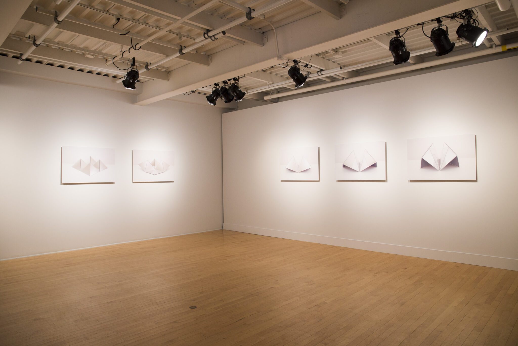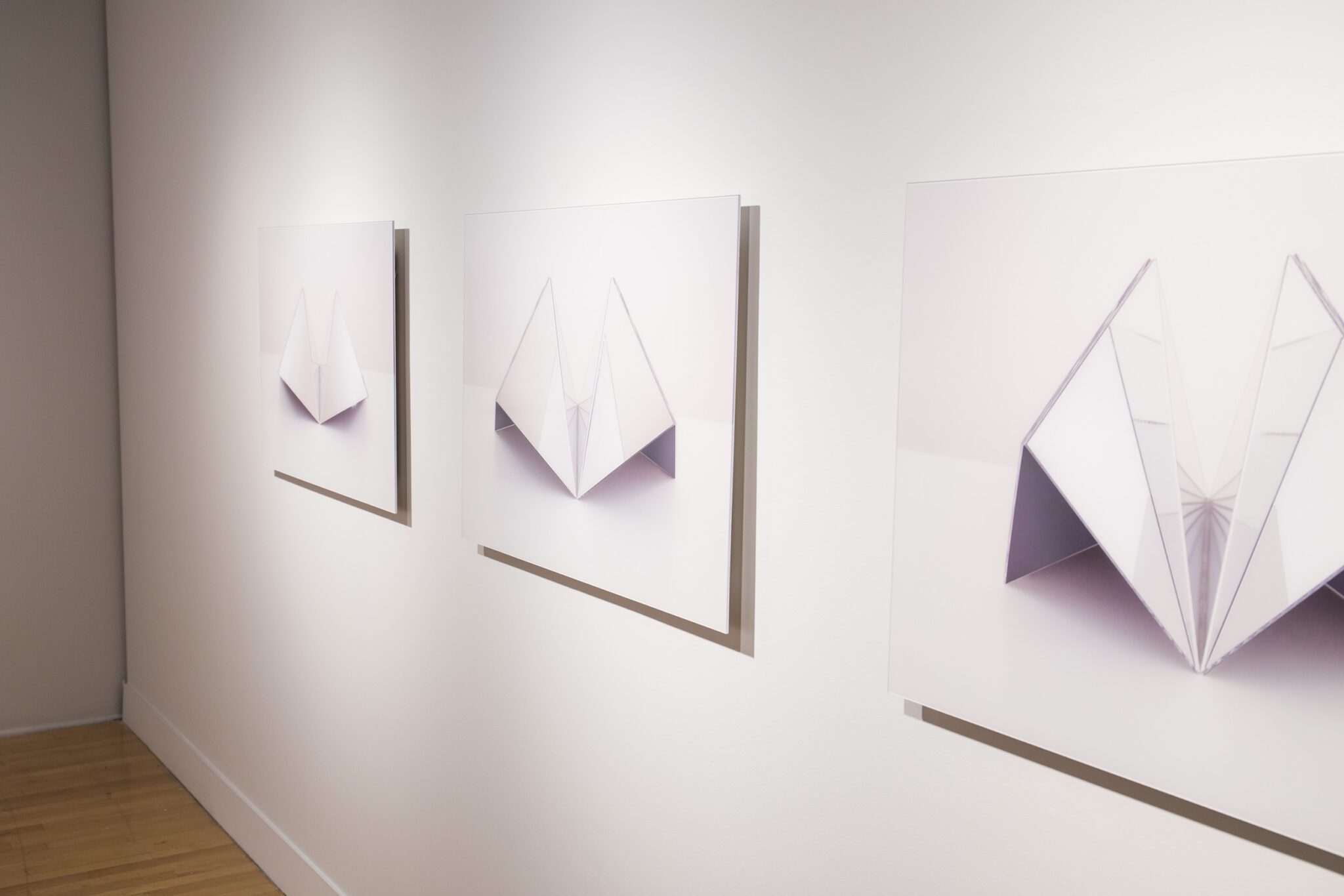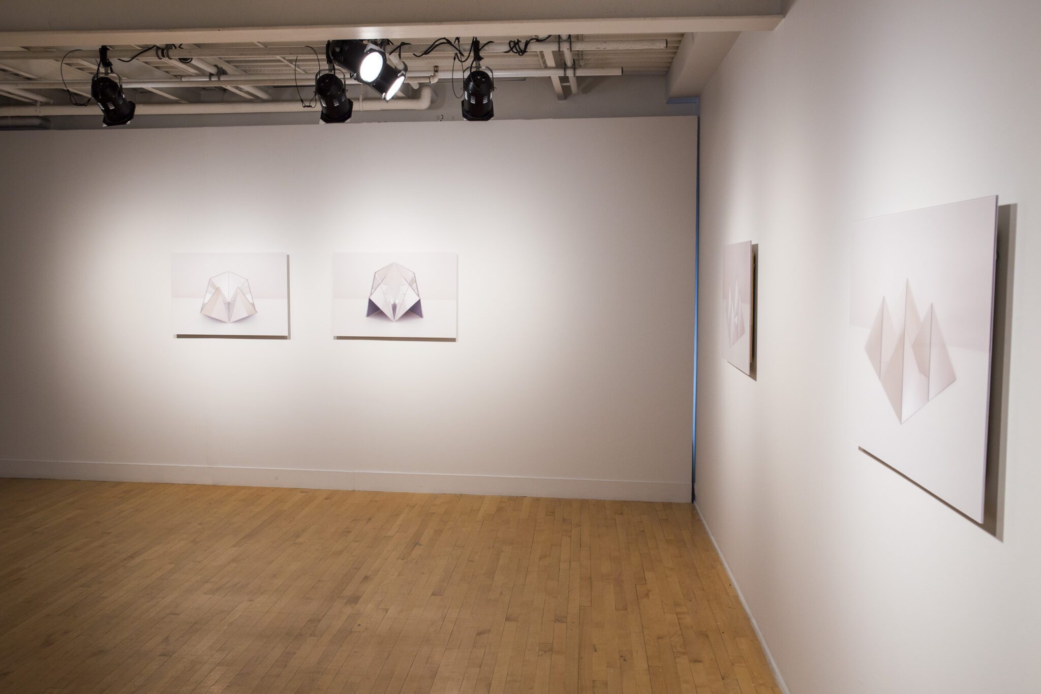 Explorant l’espace et le contre-espace, la lumière et sa réfraction, les photographies de Caroline Cloutier présentent un module de miroirs qui, selon de multiples déclinaisons, fait se refléter les surfaces elles-mêmes et l’aire libre qui les environne. Posés et composés, les miroirs sont donnés à voir en tant qu’objets physiques, à la manière d’une nature morte. Mais ils font aussi apparaître les reflets d’un espace intangible, morcelé par les plis et replis de la composition. Le hors-champ qui d’ordinaire se situe autour de l’image se retrouve en quelque sorte à l’intérieur de la photographie, se multipliant sur de nombreuses facettes. Les maintes réfractions de plans et de lumières appellent à s’égarer dans un jeu de détournement de la perspective et dans une réorientation constante du regard. L’œil peut chercher à se créer un parcours qui l’amènera à sortir du cadre pour atteindre les confins de l’espace, mais aussi à trouver une zone à l’intérieur de l’image où tout semble converger.