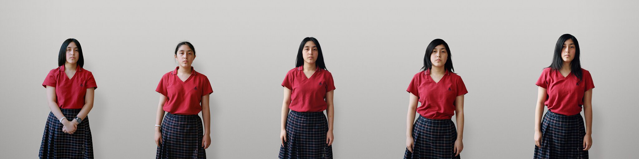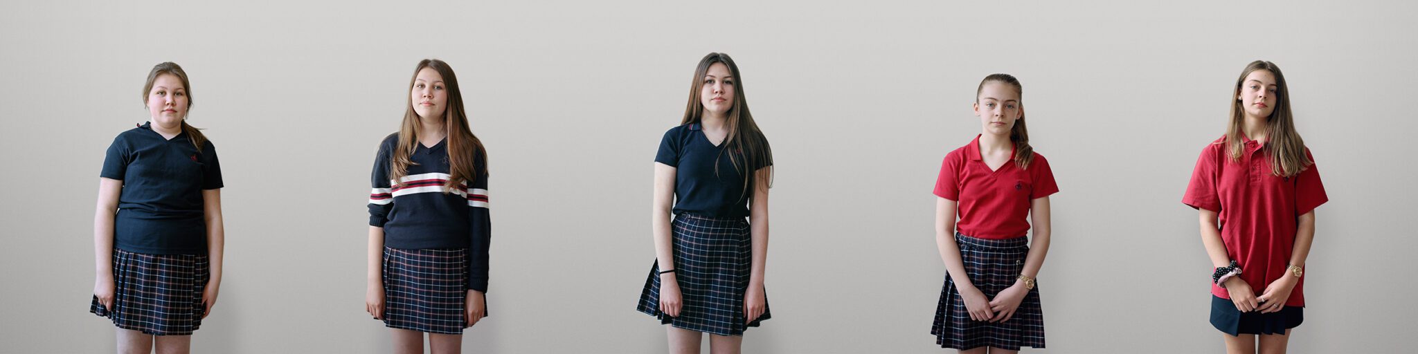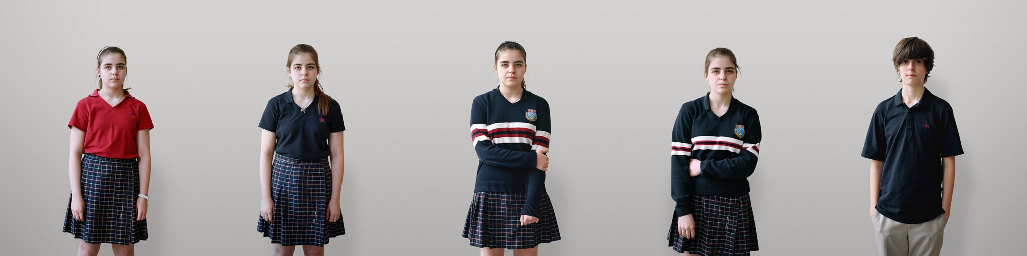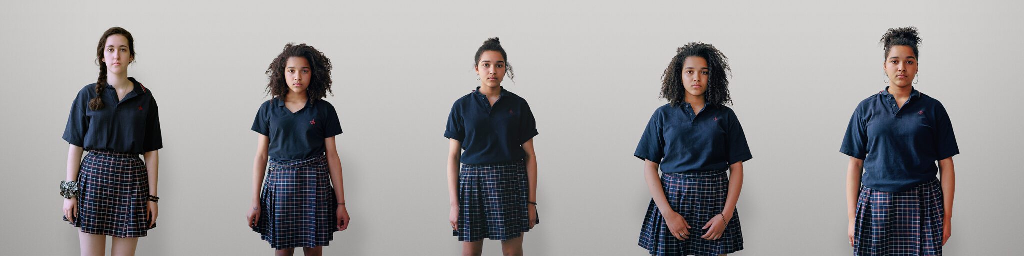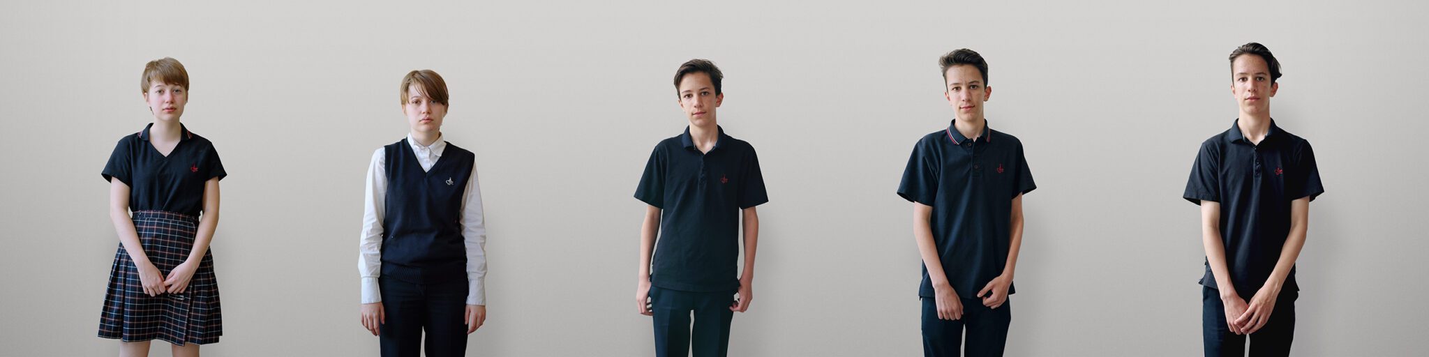 This project grew out of Jacinthe Robillard’s fascination with the uniforms worn by students at Collège Jean-Eudes, a private high school in Montréal’s Rosemont neighbourhood where the artist had been teaching photography. Having never herself attended a school where uniforms were required, she conceived a series that captured their “creative potential”: the fact that, despite imparting an overall look of sameness, they are habitually worn in ways that subtly express the student’s personality.