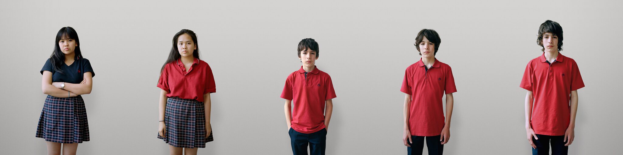 Over the past twenty years, the imposition of uniforms has been on the rise in what are referred to as “high-poverty” schools. In historically working-class but steadily gentrifying neighbourhoods like Rosemont, they serve to mask the wide diversity of the students’ socio-economic backgrounds. Yet, as Robillard perceived, behind the veneer of homogeneity can be discerned signs of flourishing individualities. Adjusting her working method, she resolved to photograph the same group of students over several years (invariably employing an identical neutral background and composition) in order to document not only the physical evolution of the adolescent body, but also the less tangible formation of identity. The visual regularity of Robillard’s portraits encourages a close examination of the means by which teenagers negotiate the boundary between conformity and difference. Her images allow us to observe—and recall—the often painfully disjointed process of transitioning into adulthood.