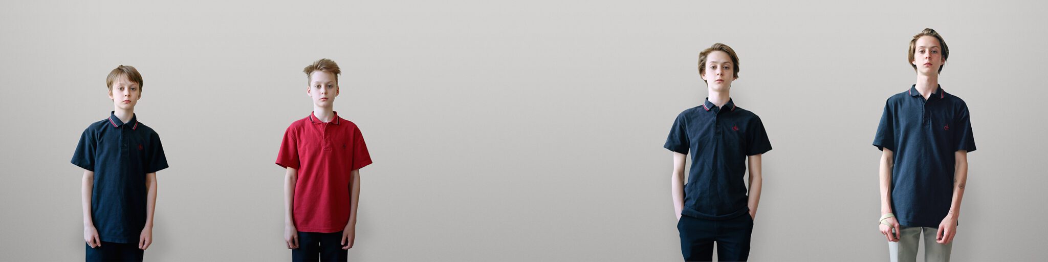 Pourtant, comme Robillard l’a bien compris, derrière le vernis d’uniformité apparaissent des signes révélant des individualités en pleine affirmation. Ajustant sa méthode de travail, l’artiste a entrepris de photographier plusieurs fois le même groupe d’élèves durant quelques années (toujours sur le même fond neutre et avec une composition identique) dans l’idée de capter non seulement l’évolution physique du corps adolescent, mais aussi la construction de l’identité, réalité moins tangible. La constance visuelle qui caractérise les portraits de Robillard invite à un examen approfondi des moyens qu’ont employés ces jeunes gens pour se jouer des frontières entre conformité et différence. Ces images nous donnent à observer – et à nous rappeler – le processus souvent douloureux et fluctuant qu’est le passage à l’âge adulte.