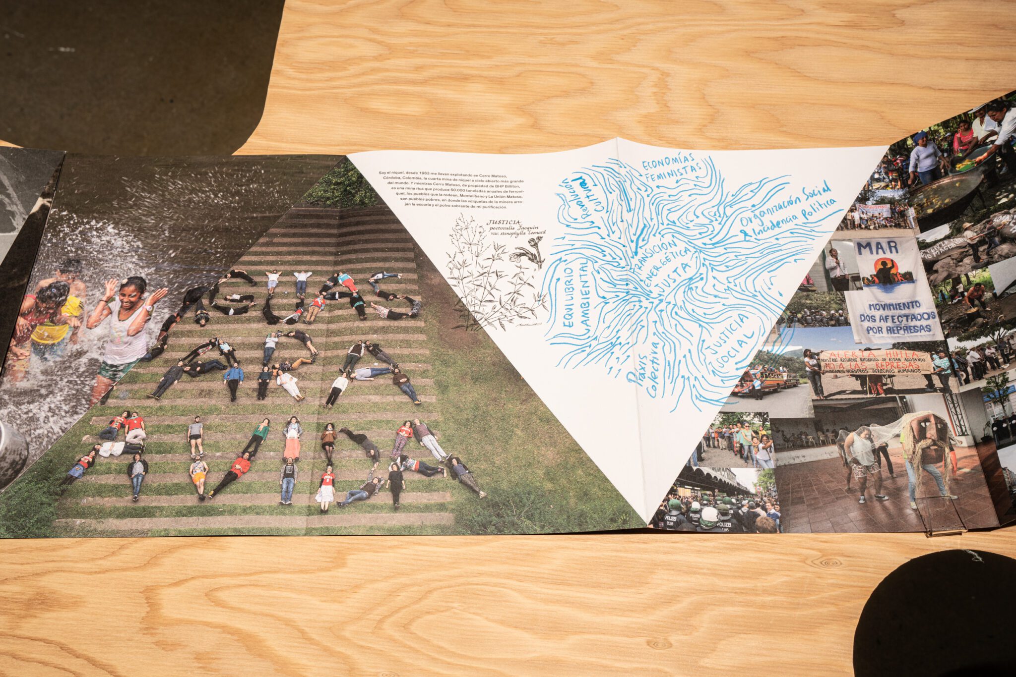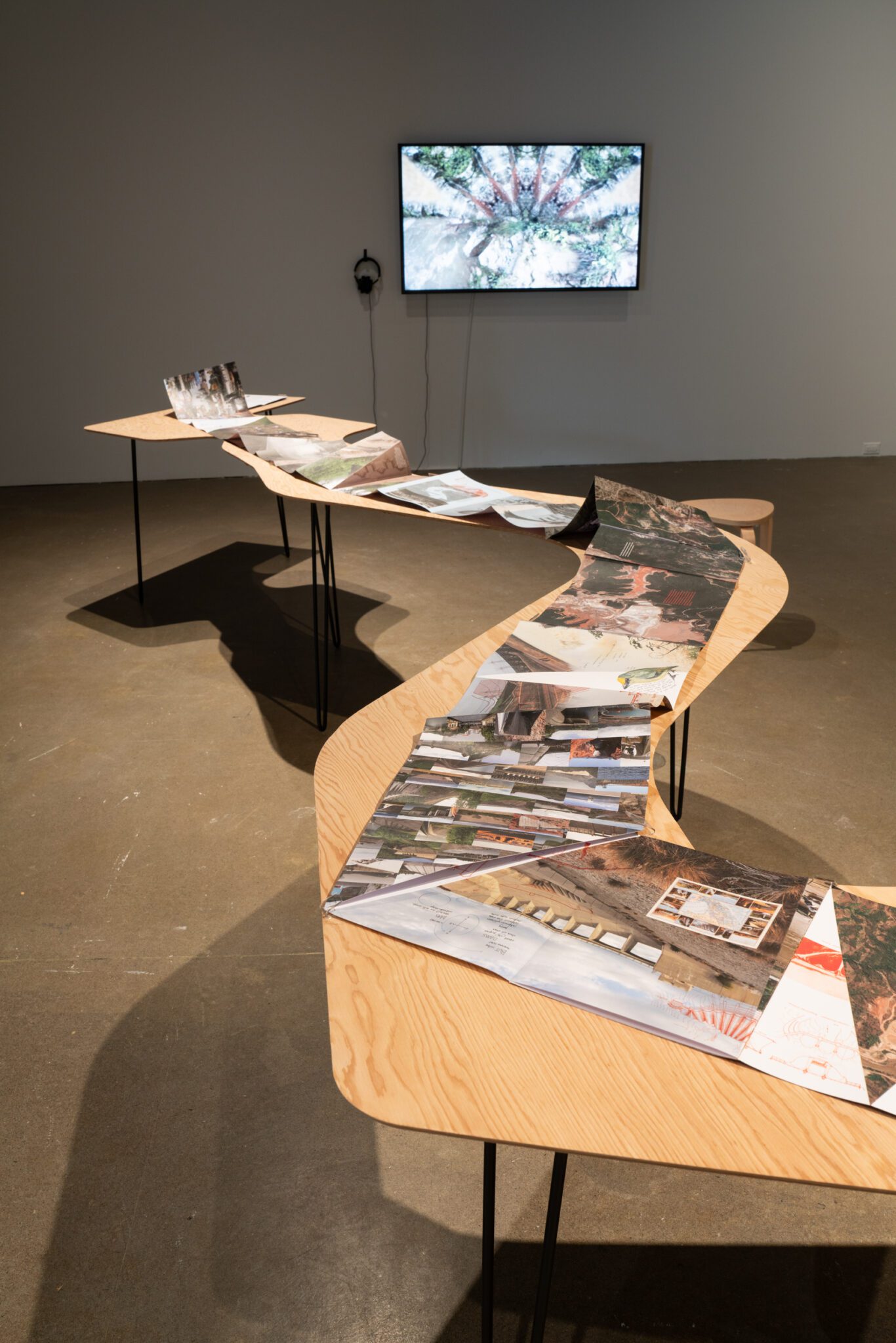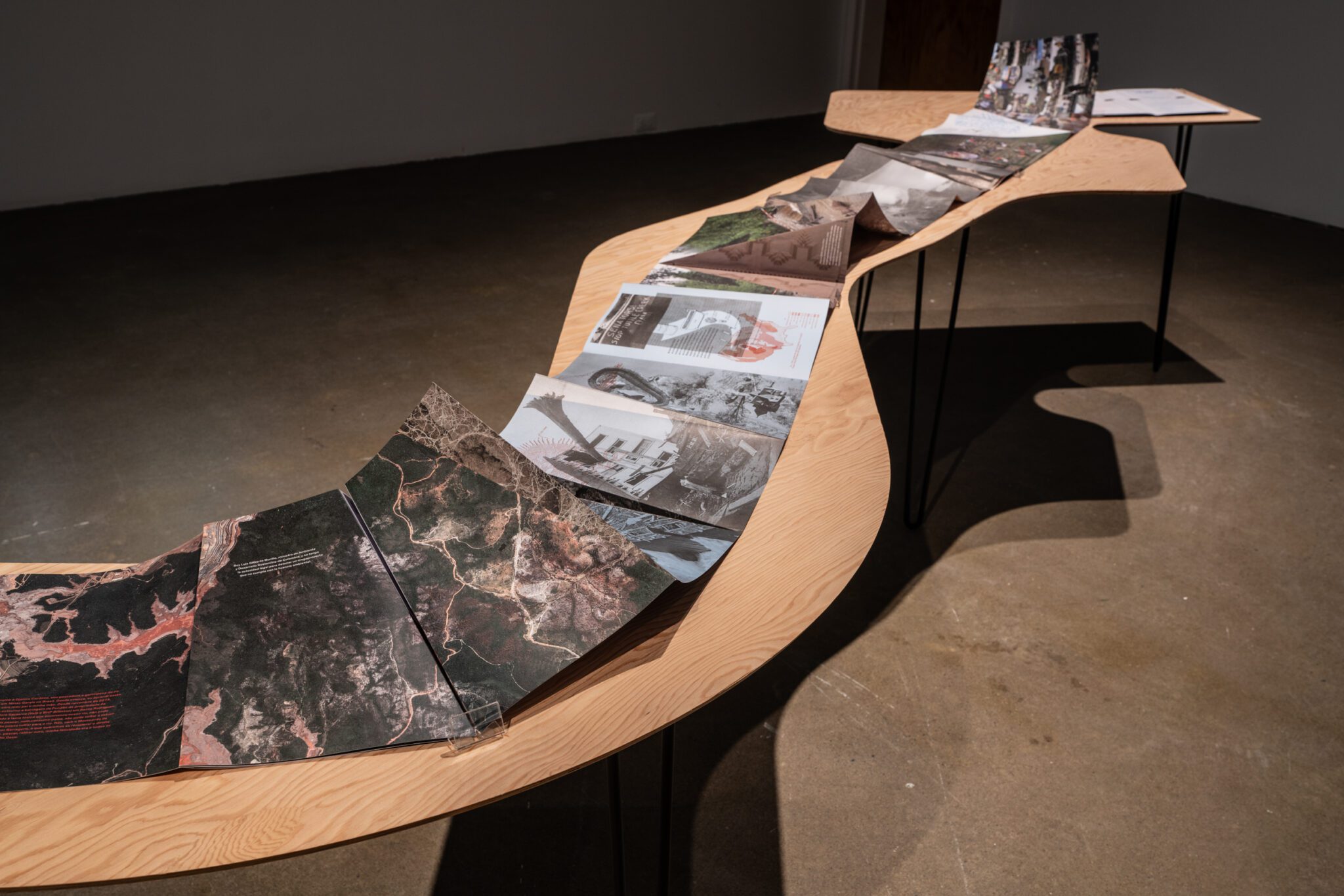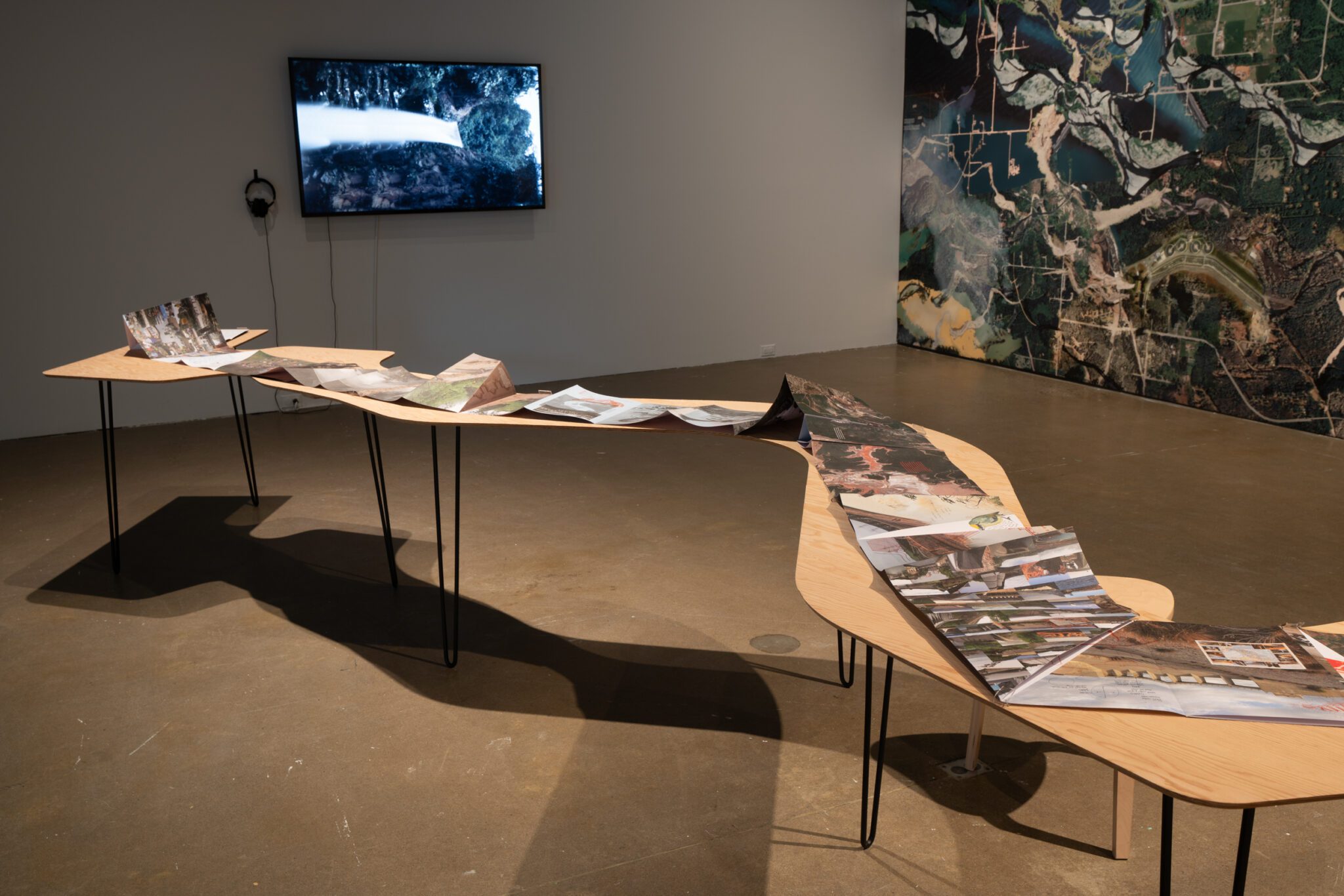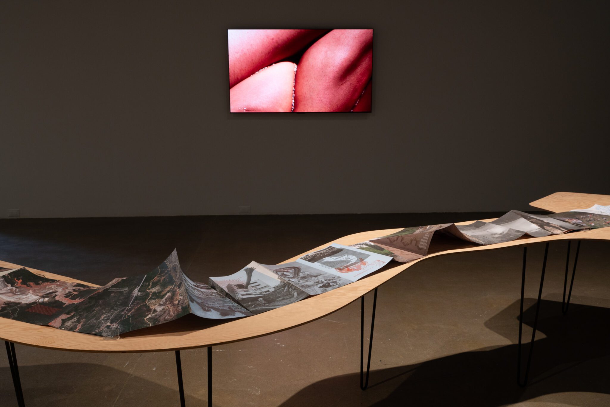 Son Serpent River Book (2017) serpente dans la galerie tel un fleuve indomptable. Ainsi déployé dans l’espace, il assume de multiples fonctions – à la fois partition, outil d’atelier, manifeste, capsule temporelle, archive vivante, etc. La vidéo Esto No Es Agua / This Is Not Water (2015) constitue un portrait similaire de la chute Las Damas dans la ville de Garzón, au sud de la Colombie. La bande sonore est composée de la manipulation des bruits de la chute, mélangés à un extrait de flûte de millo, un instrument autochtone traditionnel.