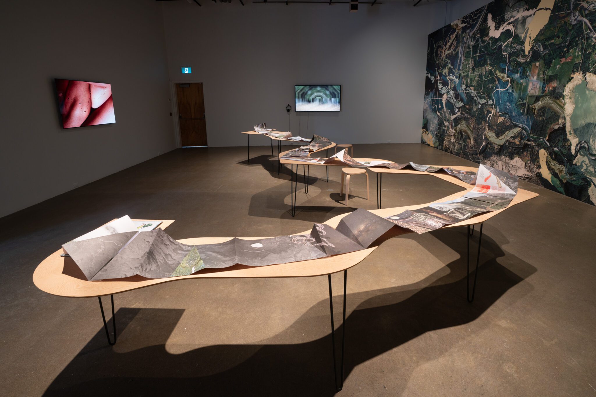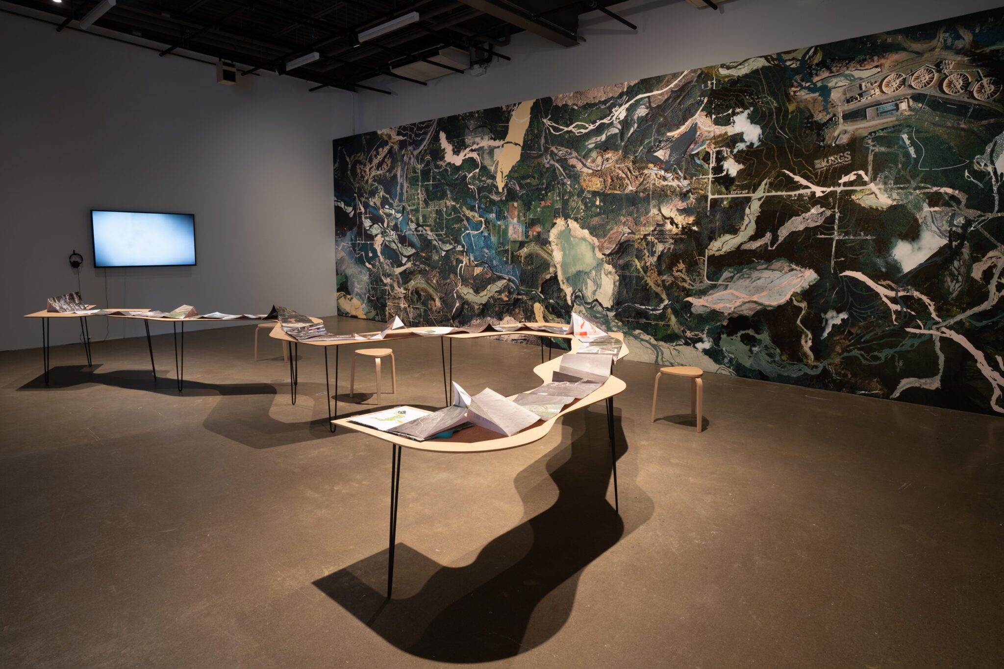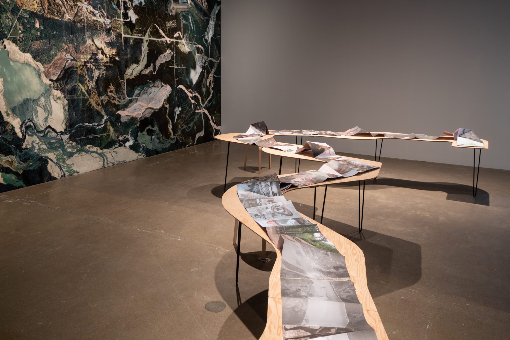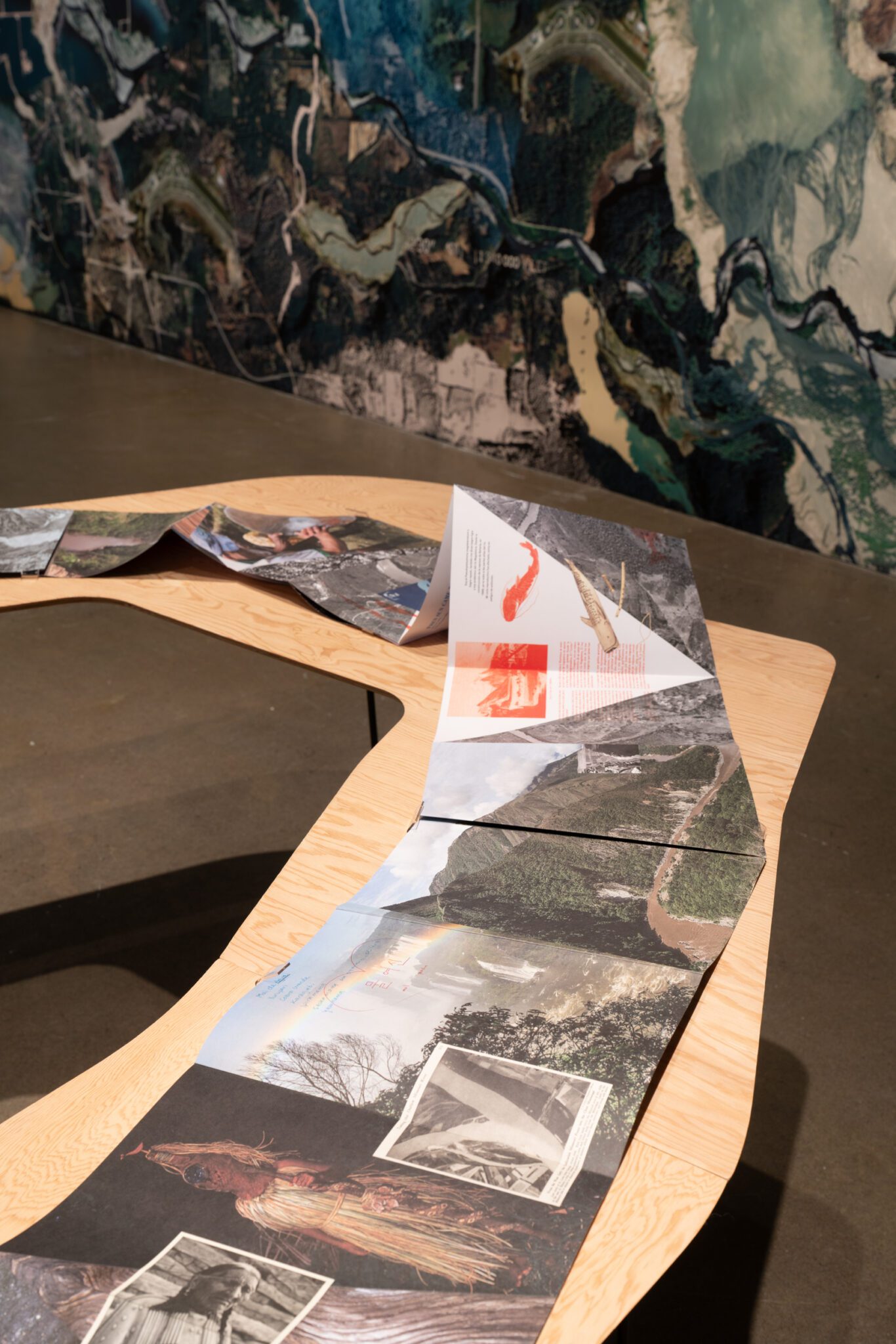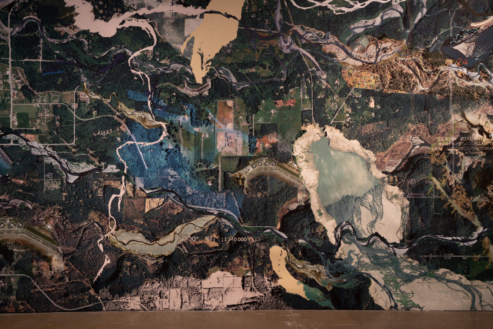 De l’autre côté de la salle, Elwha’s Healing (2022) est une fresque monumentale représentant la rivière Elwha, dans le nord-ouest des États-Unis, où des barrages érigés au début du 20ᵉ siècle ont été démantelés après des décennies de mobilisation. Le regard glisse de l’horizontalité du River Book à la verticalité d’un milieu restauré. Dans cette composition, Caycedo combine des vues satellites pour créer des images inédites de l’« hydropaysage », qui rejette le regard occidental cherchant à consommer des représentations pittoresques de la nature. Ce sentiment d’entrer soi-même dans le paysage et d’en ressentir le rythme se prolonge dans Fuel to Fire (2023). Cette projection vidéo donne à voir un rituel de pagamento, ou rituel de restitution, une performance axée sur le bien-être et la préservation du páramo de Santurbán, un écosystème connu pour ses gisements aurifères. Dans ce protocole écologique et économique autochtone, les gestes de restitution et de renoncement apparaissent comme un remède au mal engendré par l’accumulation.