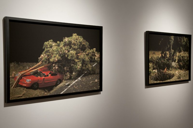La catastrophe est omniprésente dans le travail photographique, installatif et vidéographique de Catherine Plaisance. Avec l’exposition Infortunes, ce thème est l’objet d’un dialogue tendu entre une maquette disposée au centre de la galerie et suggérant la quiétude d’un paysage de campagne, d’une part, et une série de photographies montrant diverses scènes catastrophiques susceptibles de troubler cette tranquillité, d’autre part.